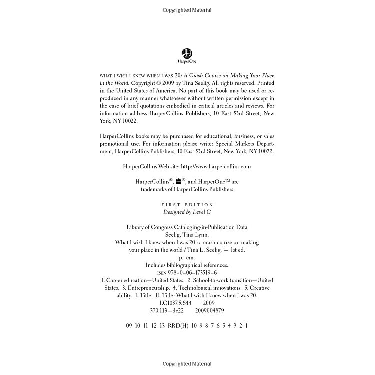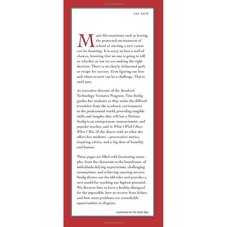 As executive director of the Stanford Technology Ventures Program, Tina Seelig guides her students as they make the difficult transition from the academic environment to the professional world, providing tangible skills and insights that will last a lifetime. Seelig is an entrepreneur, neuroscientist, and popular teacher, and in What I Wish I Knew When I Was 20 she shares with us what she offers her students—provocative stories, inspiring advice, and a big dose of humility and humor.
