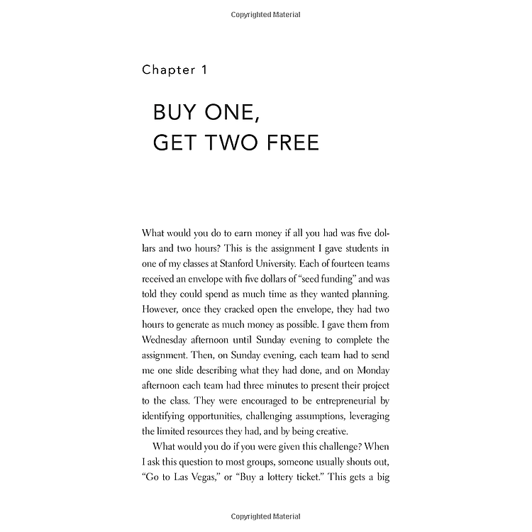 These pages are filled with fascinating examples, from the classroom to the boardroom, of individuals defying expectations, challenging assumptions, and achieving amazing success. Seelig throws out the old rules and provides a new model for reaching our highest potential. We discover how to have a healthy disregard for the impossible, how to recover from failure, and how most problems are remarkable opportunities in disguise.