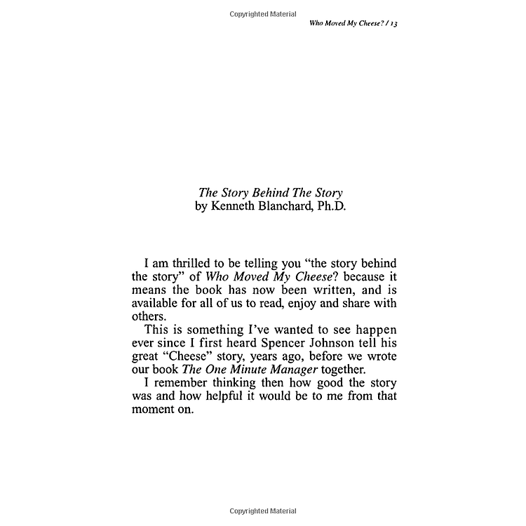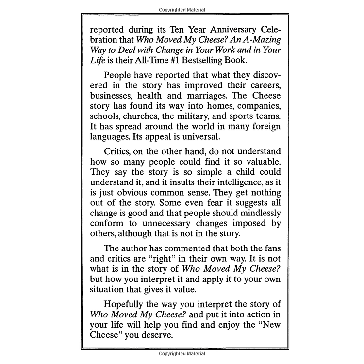 This profound book from bestselling author, Spencer Johnson, will show you how to anticipate change, adapt to change quickly, enjoy change and be ready to change quickly again and again. Discover the secret for yourself and learn how to deal with change, so that you suffer from less stress and enjoy more success in your work and in life. Written for all ages, this story takes less than an hour to read, but its unique insights can last for a lifetime.