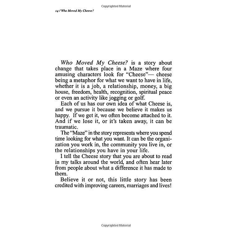 Who Moved My Cheese? is an amusing and enlightening story of four characters who live in a maze and look for cheese to nourish them and make them happy. Cheese is a metaphor for what you want to have in life – whether it is a good job, a loving relationship, money or a possession, health or spirital peace of mind. And the maze is where you look for what you want – the organisation you work in, or the family or community you live in.