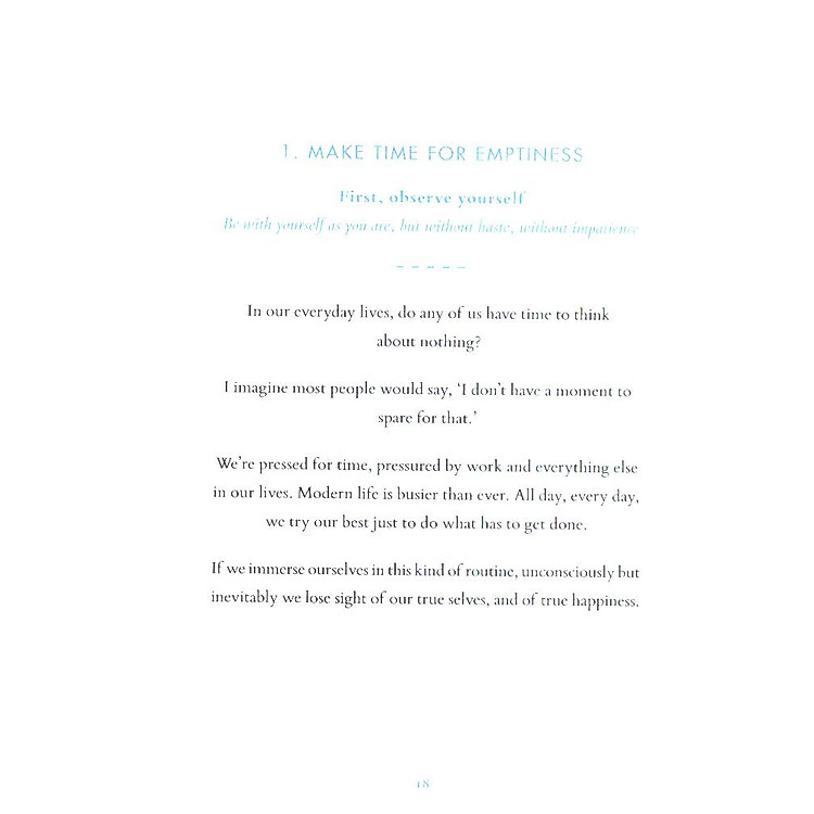 You will learn how to exhale deeply to eliminate negative emotions, to arrange your house simply to clear your thinking, to line up your shoes at night to bring order to your mind, to plant a single flower and watch it grow, to worry less about what you cannot control, and so much more . . .