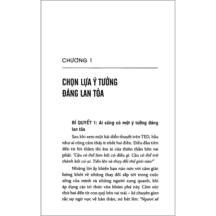 Hùng Biện Kiểu Ted 1 không chỉ là một cuốn sách hướng dẫn về nghệ thuật hùng biện, mà còn là một bộ công cụ giúp bạn khám phá và phát triển phong cách riêng trong diễn thuyết. Thay vì cung cấp những quy tắc cứng nhắc, tác giả khuyến khích bạn nhìn nhận các kỹ thuật trình bày như những lời khuyên có thể áp dụng tùy vào từng tình huống khác nhau. Điều này mở ra một không gian sáng tạo, nơi bạn có thể chia sẻ những gì mình thực sự tâm huyết theo cách độc đáo của riêng mình.