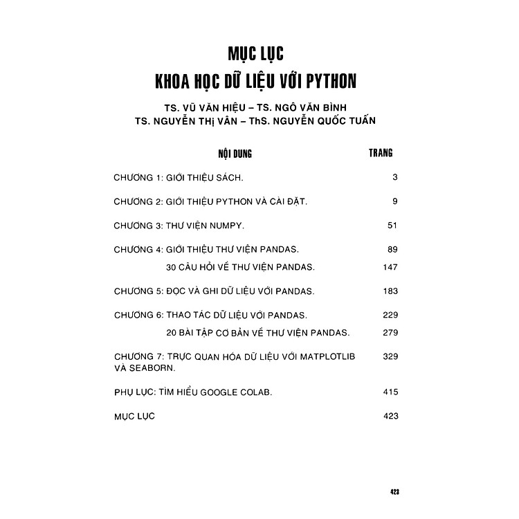 - Cuốn sách “Khoa Học Dữ Liệu Với Python” gồm 424 trang, khổ 16 x 24 cm, chia thành 7 chương và 1 phụ lục.