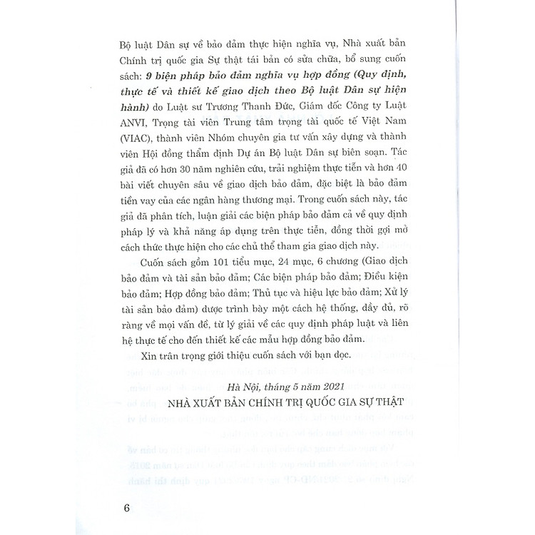 Với mục đích cung cấp cho bạn đọc những thông tin cơ bản về các biện pháp bảo đảm theo quy định của Bộ luật Dân sự năm 2015, Nghị định số 21/2021/NĐ-CP ngày 19/3/2021 quy định thi hành Bộ luật Dân sự về bảo đảm thực hiện nghĩa vụ, Nhà xuất bản Chính trị quốc gia Sự thật tái bản có sửa chữa, bổ sung cuốn sách: 9 biện pháp bảo đảm nghĩa vụ hợp đồng (Quy định, thực tế và thiết kế giao dịch theo Bộ luật Dân sự hiện hành) do Luật sư Trương Thanh Đức, Giám đốc Công ty Luật ANVI, Trọng tài viên Trung tâm trọng tài quốc tế Việt Nam (VIAC), thành viên Nhóm chuyên gia tư vấn xây dựng và thành viên Hội đồng thẩm định Dự án Bộ luật Dân sự biên soạn. Tác giả đã có hơn 30 năm nghiên cứu, trải nghiệm thực tiễn và hơn 40 bài viết chuyên sâu về giao dịch bảo đảm, đặc biệt là bảo đảm tiền vay của các ngân hàng thương mại. Trong cuốn sách này, tác giả đã phân tích, luận giải các biện pháp bảo đảm cả về quy định pháp lý và khả năng áp dụng trên thực tiễn, đồng thời gợi mở cách thức thực hiện cho các chủ thể tham gia giao dịch này.