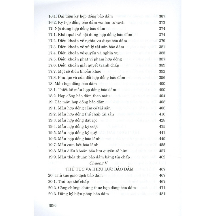 Cuốn sách gồm 101 tiểu mục, 24 mục, 6 chương (Giao dịch bảo đảm và tài sản bảo đảm; Các biện pháp bảo đảm; Điều kiện bảo đảm; Hợp đồng bảo đảm; Thủ tục và hiệu lực bảo đảm; Xử lý tài sản bảo đảm) được trình bày một cách hệ thống, đầy đủ, rõ ràng về mọi vấn đề, từ lý giải về các quy định pháp luật và liên hệ thực tế cho đến thiết kế các mẫu hợp đồng bảo đảm.