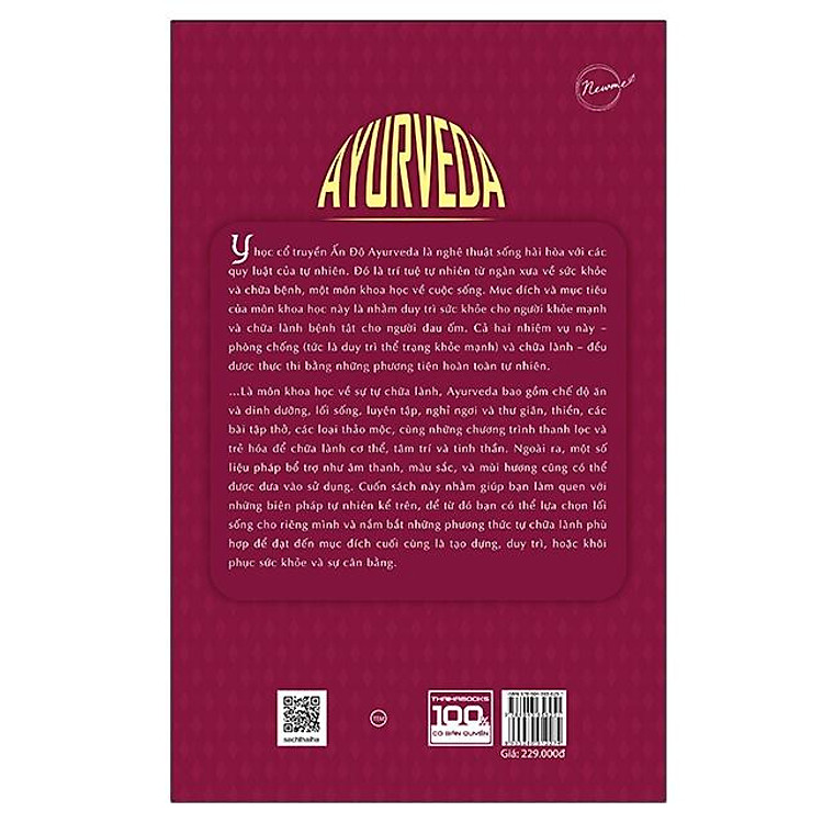[ThaiHaBooks] Y thuật Ayurveda là nghệ thuật sống hài hòa với các quy luật tự nhiên. Đó là trí tuệ tự nhiên từ ngàn xưa về sức khỏe và chữa bệnh, một môn khoa học về cuộc sống. Mục đích và mục tiêu của môn khoa học này là nhằm duy trì sức khỏe cho người khỏe mạnh và chữa lành bệnh tật cho người đau ốm. Cả hai nhiệm vụ này – phòng chống (tức là duy trì thể trạng khỏe mạnh) và chữa lành – đều được thực thi bằng những phương tiện hoàn toàn tự nhiên.