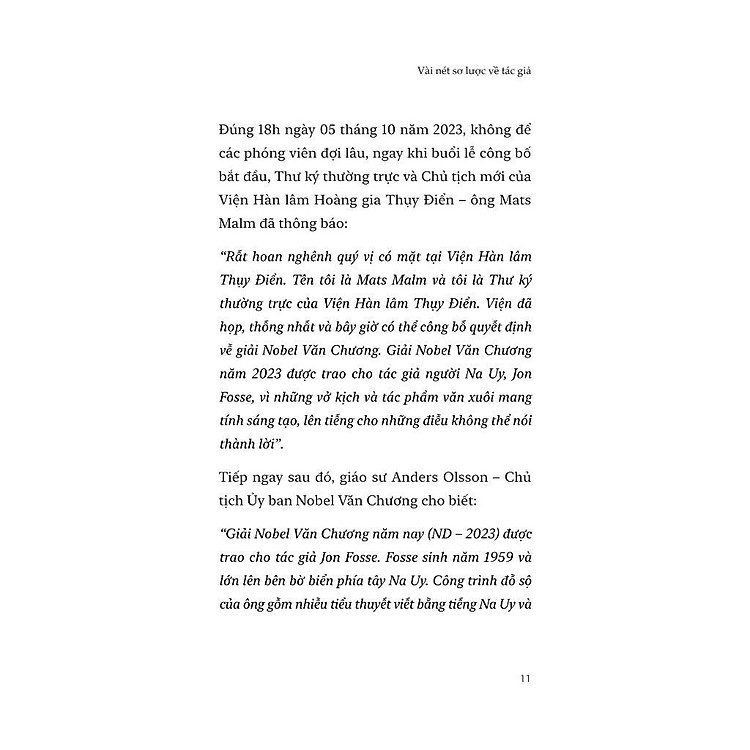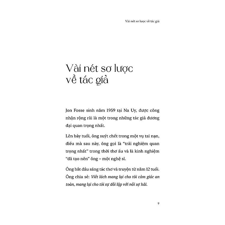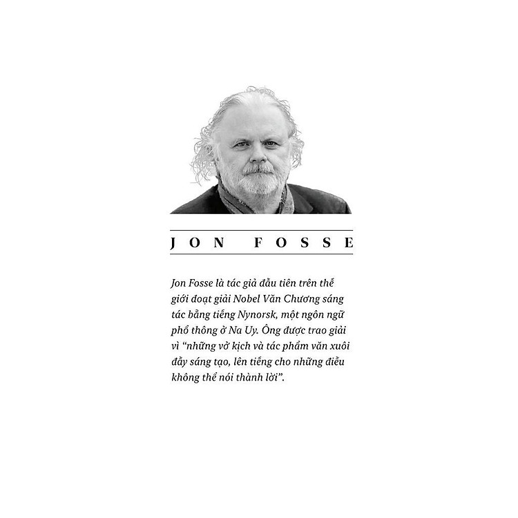 Jon Fosse sinh năm 1959 tại Na Uy, được công nhận rộng rãi là một trong những tác giả đương đại quan trọng nhất. Lên bảy tuổi, ông suýt chết trong một vụ tai nạn, điều mà sau này, ông gọi là “trải nghiệm quan trọng nhất” trong thời thơ ấu và là kinh nghiệm “đã tạo nên” ông – một nghệ sĩ. Ông bắt đầu sáng tác thơ và truyện từ năm 12 tuổi. Ông chia sẻ: Viết lách mang lại cho tôi cảm giác an toàn, mang lại cho tôi sự đối lập với nỗi sợ hãi. Jon Fosse đã nhận được nhiều giải thưởng trong nước và quốc tế khác nhau trong những năm cống hiến của mình. Công trình đồ sộ của ông bao gồm vô số vở kịch, tiểu thuyết, tuyển tập thơ, tiểu luận, sách thiếu nhi hiện đã được xuất bản sang 44 ngôn ngữ và các vở kịch được công diễn hàng ngàn lần trên khắp thế giới. Jon Fosse là tác giả đầu tiên trên thế giới đoạt giải Nobel Văn chương sáng tác bằng tiếng Nynorsk, một ngôn ngữ phổ thông ở Na Uy. Ông được trao giải vì “những vở kịch và tác phẩm văn xuôi đầy sáng tạo, lên tiếng cho những điều không thể nói thành lời”.