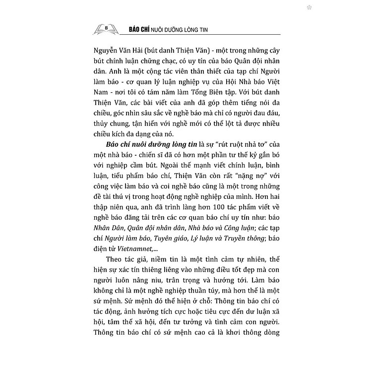 Mang thông điệp về khát vọng gieo trồng, vun đắp niềm tin cho những người yêu thương, trân quý nghề báo và nền báo chí cách mạng Việt Nam đã có bề dày lịch sử truyền thống tròn 100 tuổi, tác giả Nguyễn Văn Hải đã tuyển chọn 50 tác phẩm báo chí giá trị, tập hợp thành cuốn sáchBáo chí nuôi dưỡng lòng tin.