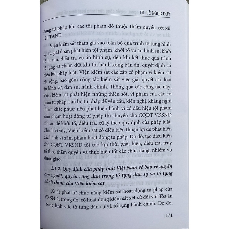 Nhằm đáp ứng nhu cầu tìm hiểu và nghiên cứu của bạn đọc, Nhà xuất bản Tư pháp xuất bản cuốn “Bảo vệ quyền con người, quyền công dân trong hoạt động tố tụng của Viện kiểm sát nhân dân ở Việt Nam hiện nay” của TS. Lê Ngọc Duy. Thông qua việc phân tích, luận giải về mặt lý luận và đánh giá, khảo cứu về mặt thực tiễn bảo vệ quyền con người, quyền công dân trong hoạt động tố tụng của Viện kiểm sát nhân dân, tác giả đề xuất một số giải pháp mang tính gợi mở cần được tiếp tục nghiên cứu nhằm hoàn thiện pháp luật và nâng cao hiệu quả bảo vệ quyền con người, quyền công dân trong hoạt động tố tụng của Viện kiểm sát nhân dân ở Việt Nam hiện nay. Nhà xuất bản giữ nguyên một số ý kiến của tác giả trong cuốn sách có thể còn có quan điểm khác nhau để bạn đọc tham khảo.