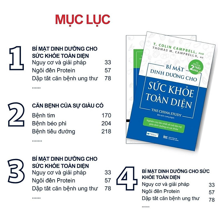 Nội dung sách:“Bí mật dinh dưỡng cho sức khoẻ toàn diện” không chỉ là một cuốn sách đơn thuần mà nó còn là một công trình nghiên cứu khoa học lớn nhất, kéo dài trong suốt 20 năm về mối liên hệ giữa dinh dưỡng và bệnh tật của con người từng được thực hiện trên thế giới của hai tác giả đồng thời là hai cha con, tiến sĩ T. Colin Campbell và bác sĩ Thomas M Campbell II.Cuốn sách đã và đang được đón nhận rộng rãi trên toàn thế giới. Tính đến thời điểm hiện tại, “Bí mật dinh dưỡng cho sức khoẻ toàn diện” đã được dịch ra hơn 50 thứ tiếng với trên 2 triệu bản in được bán ra. Hiểu biết về các phương pháp dinh dưỡng sẽ giúp mọi người chia tay các bệnh mãn tính và nâng cao sức khỏe, có được cuộc sống hạnh phúc hơn.