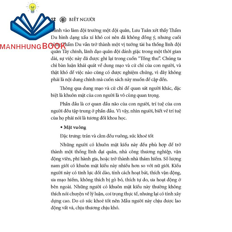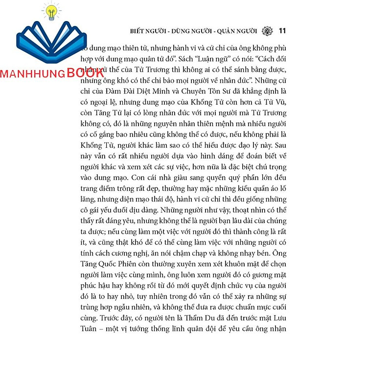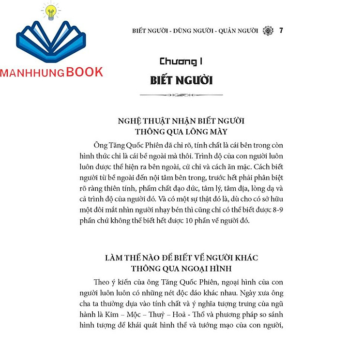 Cuốn sách này sẽ mang đến cho bạn những phương pháp quan trọng để nhận biết người, phải nhanh trí, tỉnh táo khi dùng người. Phải nhận biết được cấp trên, cấp dưới, nhận biết từ dáng vẻ bên ngoài, đến nội tâm bên trọng, nhận biết người từ xa đến gần; nhận biết người theo thế lực, theo thời cuộc, nhận biết người lúc nhỏ, nhận biết người lúc lớn, nhận biết người lúc thiện, nhận biết người lúc ác. Mọi người trong thiên hạ học được các biết người này có thể thấy rõ hết mọi chuyện, việc biết người sẽ thông đồng bén giọ
