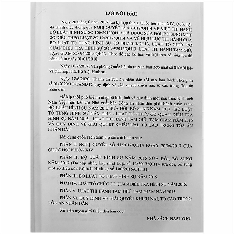 Để kịp thời phổ biến những Bộ luật, Luật và quy định mới nêu trên, Nhà sách Nam Việt phối hợp với Nhà xuất bản Công an nhân dân phát hành cuốn sách: Bộ Luật Hình Sự 2015 sửa đổi, bổ sung năm 2017 – Bộ Luật Tố Tụng Hình Sự 2015 – Luật Tổ Chức Cơ Quan Điều Tra Hình Sự – Luật Thi Hành Tạm Giữ, Tạm Giam Năm và Quy Định Về Giải Quyết Khiếu Nại, Tố Cáo Trong Tòa Án Nhân Dân