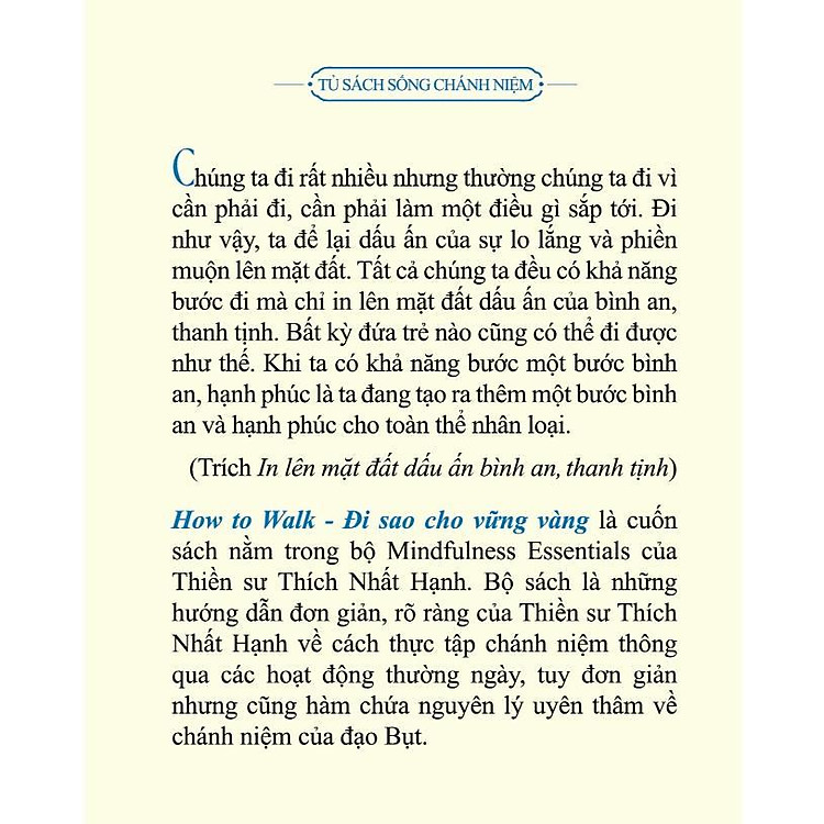Chúng ta đi rất nhiều nhưng thường chúng ta đi vì cần phải đi, cần phải làm một điều gì sắp tới. Đi như vậy, ta để lại dấu ấn của sự lo lắng và phiền muộn lên mặt đất. Tất cả chúng ta đều có khả năng bước đi mà chỉ in lên mặt đất dấu ấn của bình an, thanh tịnh. Bất kỳ đứa trẻ nào cũng có thể đi được như thế. Khi ta có khả năng bước một bước bình an, hạnh phúc là ta đang tạo ra thêm một bước bình an và hạnh phúc cho toàn thể nhân loại.