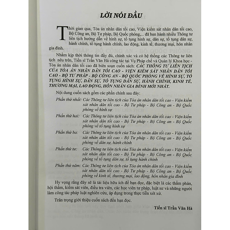 Nhằm kịp thời thông tin đầy đủ, chính xác và có hệ thống các Thông tư liên tịch nêu trên, Tiến sĩ Trần Văn Hà công tác tại Vụ Pháp chế và Quản lý Khoa học – Tòa án nhân dân tối cao đã biên soạn cuốn sách: Các Thông Tư Liên Tịch Của Tòa Án Nhân Dân Tối Cao, Viện Kiểm Sát Nhân Dân Tối Cao, Bộ Tư Pháp, Bộ Công An, Bộ Quốc Phòng Về Hình Sự, Tố Tụng Hình Sự, Dân Sự, TTDS, Hành Chính, Kinh Tế, Thương Mại, Lao Động, Hôn Nhân Gia Đình Mới Nhất