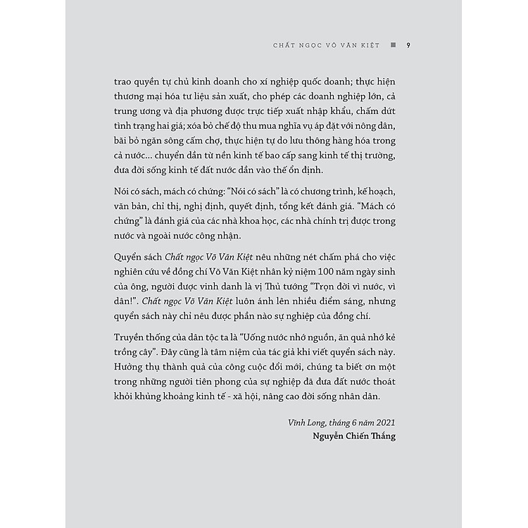 Quyển sách Chất ngọc Võ Văn Kiệt nêu những nét chấm phá cho việc nghiên cứu về đồng chí Võ Văn Kiệt nhân kỷ niệm 100 năm ngày sinh của ông, người được vinh danh là vị Thủ tướng “Trọn đời vì nước, vì dân!”. “Chất ngọc Võ Văn Kiệt” luôn ánh lên nhiều điểm sáng, nhưng quyển sách này chỉ nêu được phần nào sự nghiệp của ông. Truyền thống của dân tộc ta là “Uống nước nhớ nguồn!”, “Ăn trái nhớ người trồng cây!”. Hưởng thụ thành quả của công cuộc đổi mới, chúng ta biết ơn đồng chí Võ Văn Kiệt – người đã góp phần đưa đất nước ta thoát khỏi khủng khoảng kinh tế – xã hội, nâng cao đời sống nhân dân.