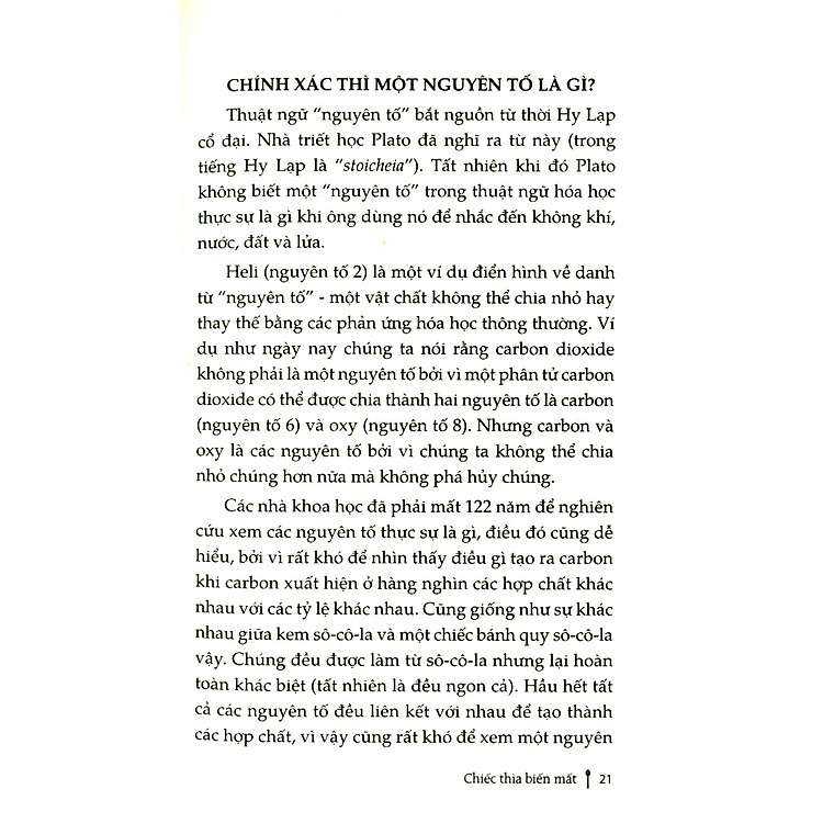 Trong CHIẾC THÌA BIẾN MẤT, những kiến thức hóa học tưởng chừng khó nhằn và cứng nhắc đã được diễn giải một cách mềm mại, gần gũi và thực sự đời thường qua những câu chuyện về lịch sử, các truyền thuyết bí ẩn và cuộc đời của những nhà khoa học. Rồi bạn sẽ nhận ra tất cả những thứ xung quanh mình, kể cả những giá trị tinh thần như cảm giác hạnh phúc, bất hạnh và đôi khi là chính mạng sống của bạn cũng được quyết định bởi chúng – những nguyên tố hóa học.