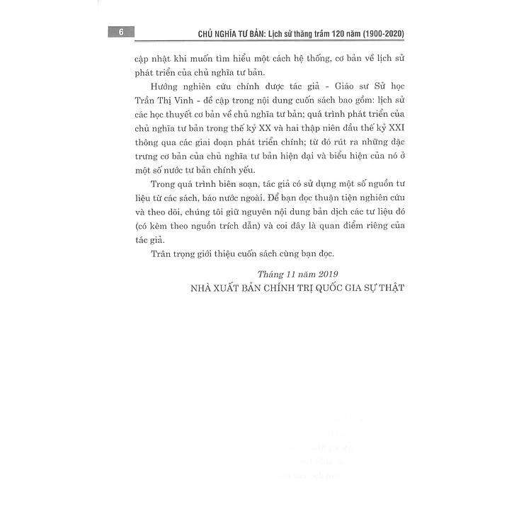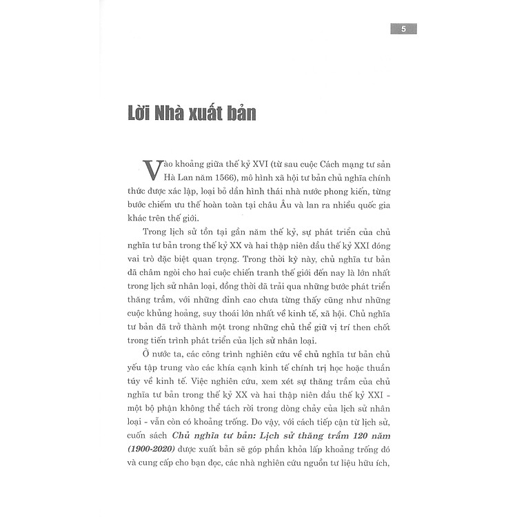 Ở nước ta, các công trình nghiên cứu về chủ nghĩa tư bản chủ yếu tập trung vào các khía cạnh kinh tế chính trị học hoặc thuần túy về kinh tế. Việc nghiên cứu, xem xét sự thăng trầm của chủ nghĩa tư bản trong thế kỷ XX và hai thập niên đầu thế kỷ XXI – một bộ phận không thể tách rời trong dòng chảy của lịch sử nhân loại – vẫn còn có khaonrg trống. Do vậy, với cách tiếp cận từ lịch sử, cuốn sách Chủ nghĩa tư bản: Lịch sử thăng trầm 120 năm (1900-2020) được xuất bản sẽ góp phần khỏa lấp khoảng trống đó và cung cấp cho bạn đọc, các nhà nghiên cứu nguồn tư liệu hữu ích, cập nhật khi muốn tìm hiểu một cách hệ thống, cơ bản về lịch sử phát triển của chủ nghĩa tư bản.