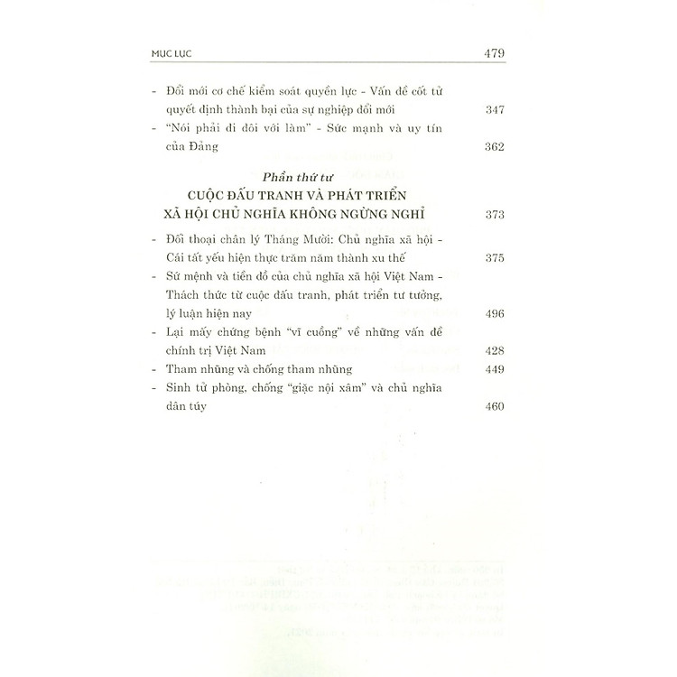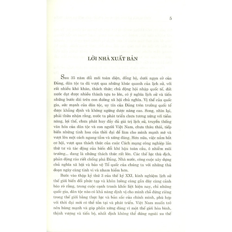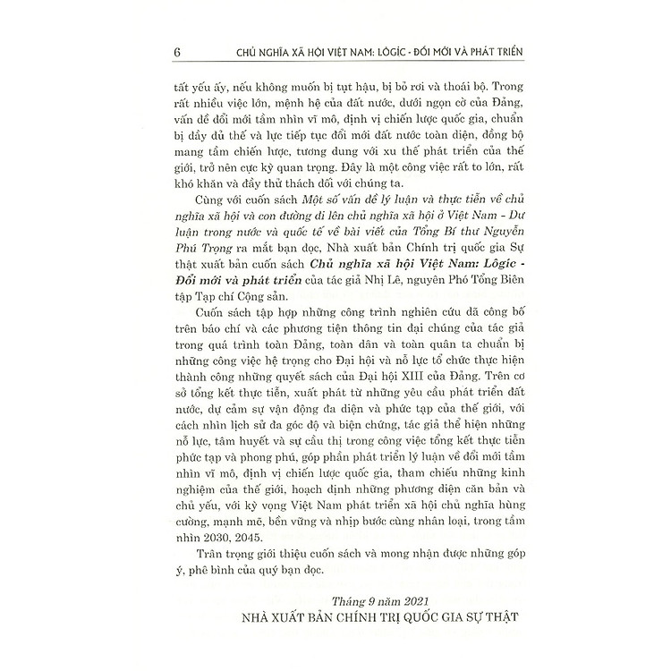 Cuốn sách tập hợp những công trình nghiên cứu đã công bố trên báo chí và các phương tiện thông tin đại chúng của tác giả trong quá trình toàn Đảng, toàn dân và toàn quân ta chuẩn bị những công việc hệ trọng cho Đại hội và nỗ lực tổ chức thực hiện thành công những quyết sách của Đại hội XIII của Đảng. Trên cơ sở tổng kết thực tiễn, xuất phát từ những yêu cầu phát triển đất nước, dự cảm sự vận động đa diện và phức tạp của thế giới, với cách nhìn lịch sử đa góc độ và biện chứng, tác giả thể hiện những nỗ lực, tâm huyết và sự cầu thị trong công việc tổng kết thực tiễn phức tạp và phong phú, góp phần phát triển lý luận về đổi mới tầm nhìn vĩ mô, định vị chiến lược quốc gia, tham chiếu những kinh nghiệm của thế giới, hoạch định những phương diện căn bản và chủ yếu, với kỳ vọng Việt Nam phát triển xã hội chủ nghĩa hùng cường, mạnh mẽ, bền vững và nhịp bước cùng nhân loại, trong tầm nhìn 2030, 2045.