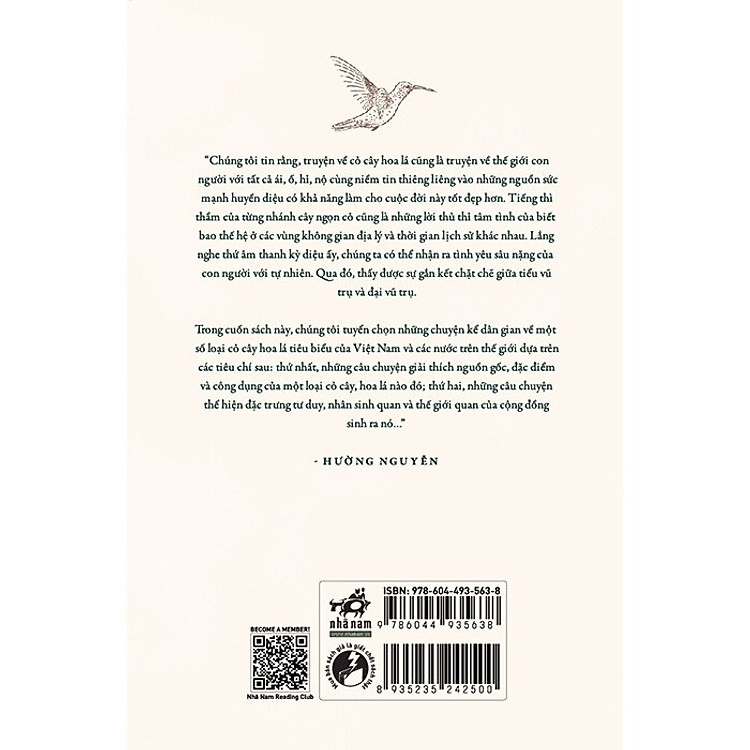 Trong cuốn sách này, chúng tôi tuyển chọn những chuyện kể dân gian về một số loại cỏ cây hoa lá tiêu biểu của Việt Nam và các nước trên thế giới dựa trên các tiêu chí sau: thứ nhất, những câu chuyện giải thích nguồn gốc, đặc điểm và công dụng của một loại cỏ cây, hoa lá nào đó; thứ hai, những câu chuyện thể hiện đặc trưng tư duy, nhân sinh quan và thế giới quan của cộng đồng sinh ra nó..” – Hường Nguyễn