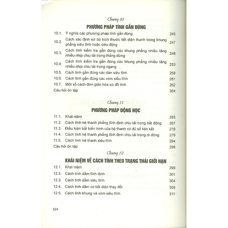Chương 10: Phương pháp tính gần đúngÝ nghĩa của các phương pháp tính gần đúngCách xác định sơ bộ kích thước tiết diện thanh trong khung phẳng siêu tĩnh hoặc siêu tĩnh hoặc siêu độngCách tính kiểm tra gần đúng các khung phẳng nhiều tầng nhiều nhịp chịu tải trọng thẳng đứngCách tính kiểm tra gần đúng các khung phẳng nhiều tấng nhiều nhịp chịu tải trọng ngangCách tính gần đúng các dàn siêu tĩnhCách tính gần đúng các vòm siêu tĩnhMột số cách đơn giản hoá sơ đồ tĩnh