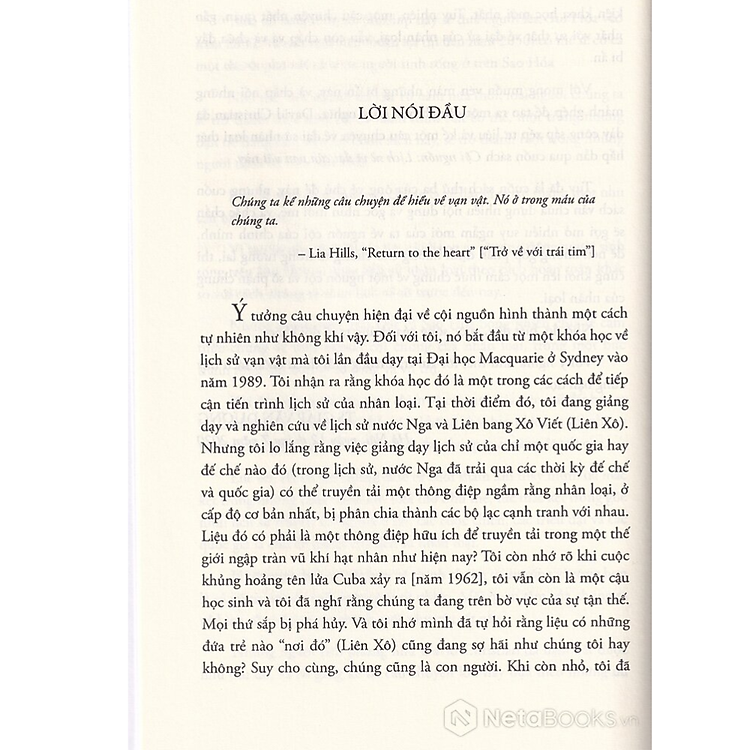 Thay vào đó, David Christian, bằng sự kết hợp khéo léo kiến thức của nhiều ngành khoa học, chỉ trong 400 trang sách, David đang kể cho chúng ta câu chuyện về cội nguồn của vạn vật, một lịch sử vĩ đại của vạn vật và dành cho tất cả mọi người trên toàn thế giới.