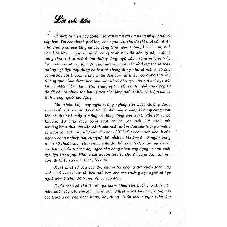 Mặt khác, hiện nay ngành công nghiệp sản xuất ximăng đang phát triển rất nhanh: đã có tới 18 nhà máy ximăng lò quay công suất lớn và 40 nhà máy ximăng lò đứng đang sản xuất. Sắp tới sẽ có khoảng 10 nhà máy công suất từ 75 vạn đến 2,5 triệu tấn ximăng/năm đưa vào vận hành sản xuất nhằm đưa sản lượng ximăng cả nước lên 50 triệu tấn/năm vào năm 2012. Sự phát triển nhanh của ngành công nghiệp này cũng đòi hỏi phải có khoảng 5 – 8 nghìn công nhân kỹ thuật cao. Tình trạng trên đòi hỏi ngành đào tạo nghề phải có thêm nhiều trường dạy nghề cho công nhân xây dựng và sản xuất vật liệu xây dựng. Nhưng các nguồn tài liệu cho 2 ngành đào tạo trên còn rất thiếu và chưa thật phù hợp.