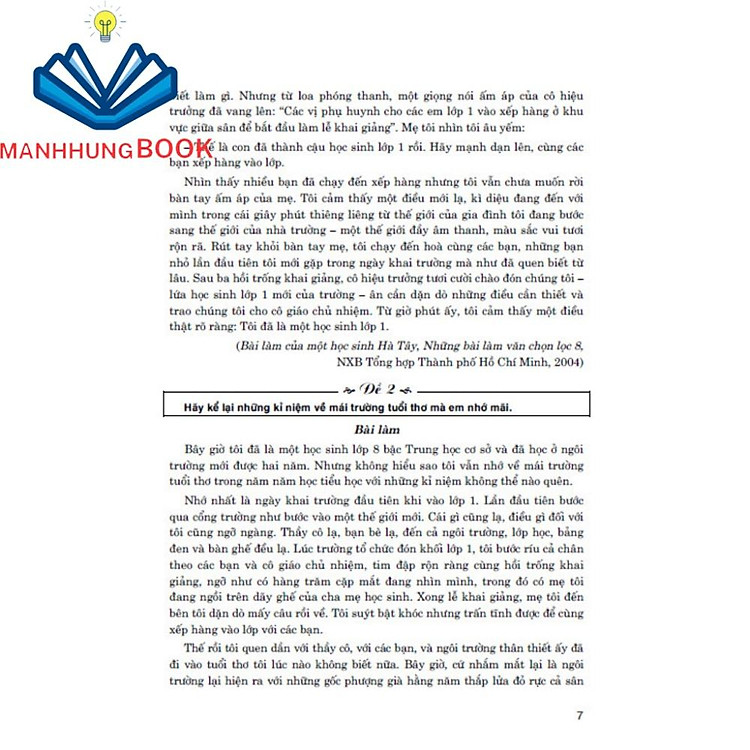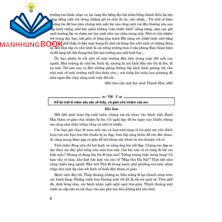 Cuốn sách là tuyển tập các bài làm văn và đoạn văn tiêu biểu để các em tham khảo với phương châm “tham khảo để tự học tốt, làm bài hay”. Chúng tôi cũng trích một số bài, đoạn văn hay của các tác giả là nhà văn, nhà nghiên cứu, các bạn học sinh đã được đăng tải trên báo chí, tạp chí và các sách tham khảo khác để các em tiện so sánh, tìm hiểu và học tập thêm. Hi vọng cuốn sách có thể giúp ích thiết thực cho các em trong việc tự học phân môn Tập làm văn ở lớp 8 theo hướng tích hợp.