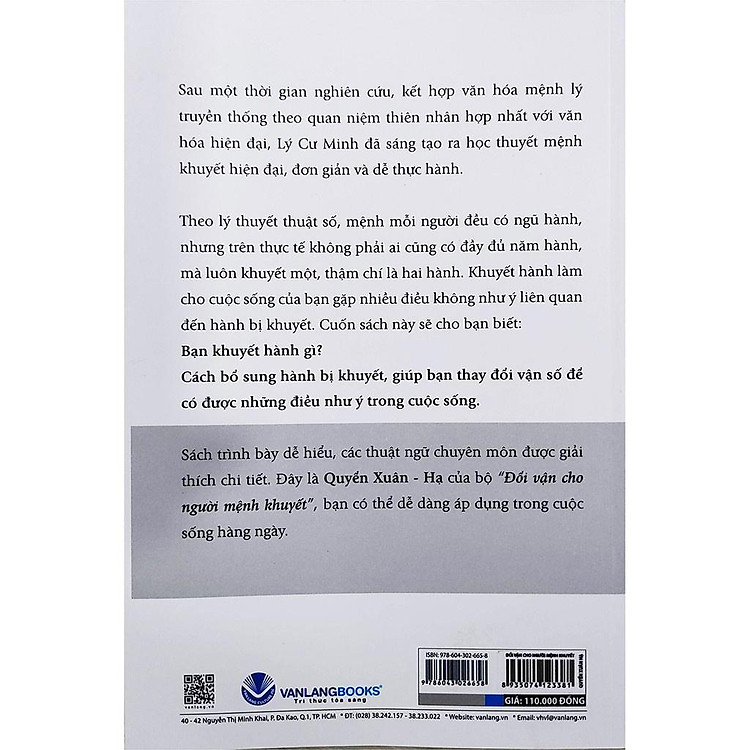 Theo lý thuyết thuật số, mệnh mỗi người đều có ngũ hành, nhưng trên thực tế không phải ai cũng có đầy đủ năm hành, mà luôn khuyết một, thậm chí là hai hành. Khuyết hành làm cho cuộc sống của bạn gặp nhiều điều không như ý liên quan đến hành bị khuyết. Cuốn sách này sẽ cho bạn biết: