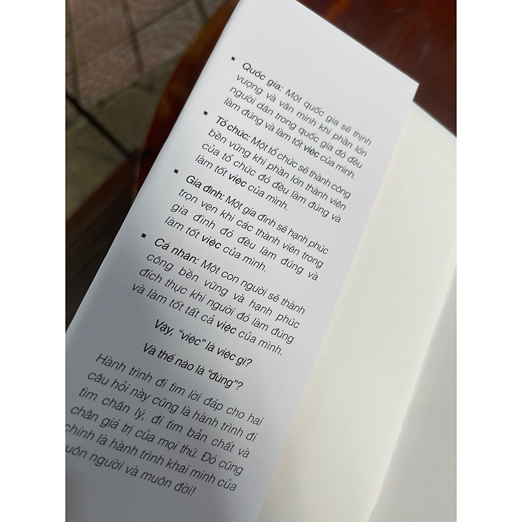 “… Căn nguyên của những gì đang diễn ra trong xã hội, căn nguyên của những vấn đề mà con người ngày nay đang gặp phải là gì và do đâu? Những thực trạng mà chúng ta nhìn thấy ngày nay của con người, của gia đình, của tổ chức và của xã hội là bắt nguồn sâu xa từ việc có quá nhiều thứ chưa được trả lại bản chất và chân giá trị của nó, cũng như có quá nhiều người chưa hiểu đúng và làm tốt những “công việc” của mình. Đó là lý do vì sao bàn về “đúng việc” và “sai việc”, cũng như chuyện định nghĩa lại mọi thứ và tìm về chân giá trị cho mọi vấn đề được chọn là góc nhìn và cách tiếp cận của cuốn sách này …”