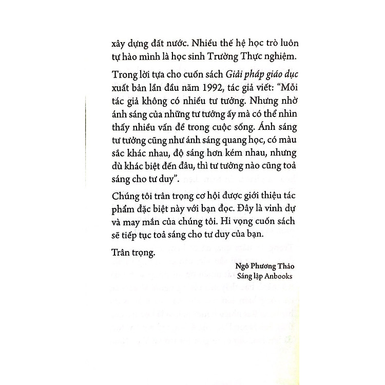 Có thế với nhiều người, những gì tác giả trình bày trong cuốn sách không phải là mới mẻ. Tháo ra, lắp lại, biến đổi để tạo ra giá trị mới là nguyên lí căn bản của chuyến đói só. Cá nhân hoá và phát triển toàn diện cũng không mới. Trao quyền cho trẻ tự học cũng không mới. Thấy có và cha mẹ lùi lại để trẻ lớn lên cũng không mới. Nhưng thật lạ. Cuốn sách này vẫn mới: sâu sắc, căn cơ, tường minh, dẫn dắt.