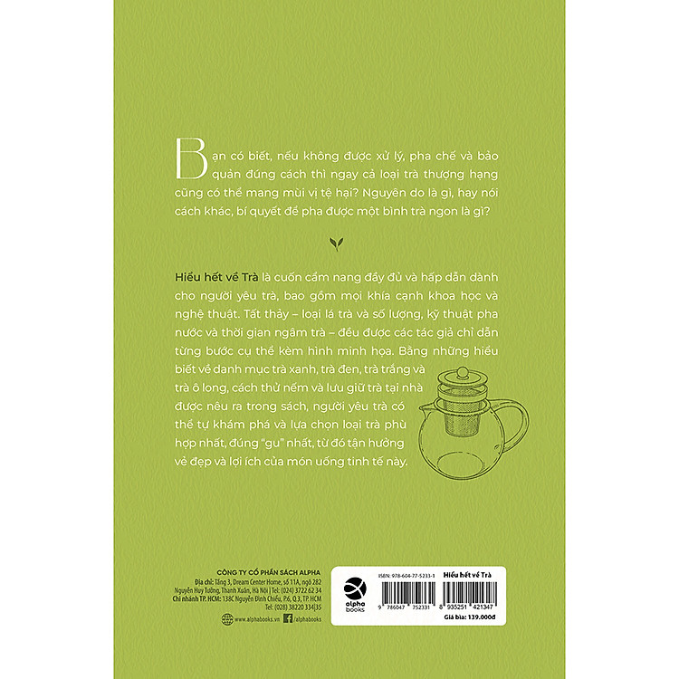 Hiểu hết về Trà là cuốn cẩm nang đầy đủ và hấp dẫn dành cho người yêu trà, bao gồm mọi khía cạnh khoa học và nghệ thuật. Tất thảy – loại lá trà và số lượng, kỹ thuật pha nước và thời gian ngâm trà – đều được các tác giả chỉ dẫn từng bước cụ thể kèm hình minh họa. Bằng những hiểu biết về danh mục trà xanh, trà đen, trà trắng và trà ô long, cách thử nếm và lưu giữ trà tại nhà được nêu ra trong sách, người yêu trà có thể tự khám phá và lựa chọn loại trà phù hợp nhất, đúng “gu” nhất, từ đó tận hưởng vẻ đẹp và lợi ích của món uống tinh tế này.