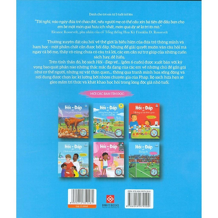 Trên tinh thần đó, bộ sách Hỏi – Đáp về… (gồm 6 cuốn) được xuất bản với kỳ vọng bao quát phần nào những thắc mắc đa dạng của các em về những chủ đề gần gũi như cơ thể người, những sự vật thân quen… thông qua tranh minh họa sống động và nội dung được chọn lọc kĩ lưỡng bởi nhóm chuyên gia của Pháp. Bộ sách hứa hẹn sẽ gieo mầm tri thức và khát khao học hỏi trong lòng độc giả nhỏ tuổi.