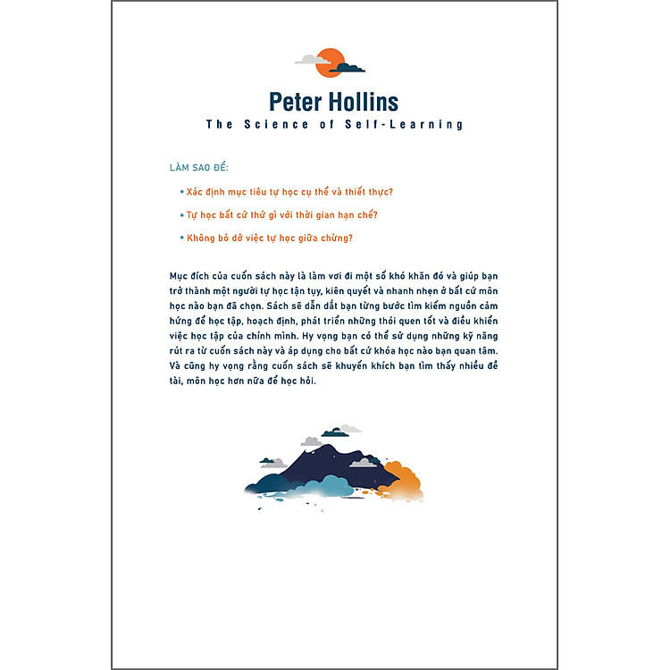 Mục đích của cuốn sách này là làm vơi đi một số khó khăn đó và giúp bạn trở thành một người tự học tận tụy, kiên quyết và nhanh nhẹn ở bất cứ môn học nào bạn đã chọn, sách sẽ dẫn dắt bạn từng bước tìm kiếm nguồn cảm hứng để học tập, hoạch định, phát triển những thói quen tốt và điều khiển việc học tập của chính mình. Hy vọng bạn có thể sử dụng những kỹ năng rút ra từ cuốn sách này và áp dụng cho bất cứ khóa học nào bạn quan tâm. Và cũng hy vọng rằng cuốn sách sẽ khuyến khích bạn tìm thấy nhiều đề tài, môn học hơn nữa để học hỏi.