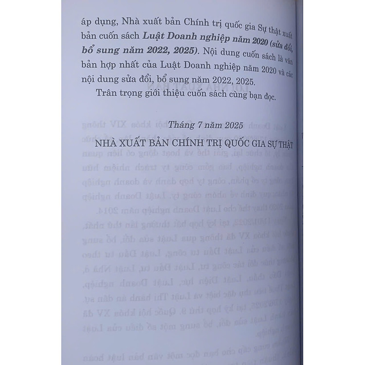 Nhằm cung cấp cho bạn đọc một văn bản luật hoàn chỉnh, thuận tiện trong việc nghiên cứu, tìm hiểu và áp dụng, Nhà xuất bản Chính trị quốc gia Sự thật xuất bản cuốn sách Luật Doanh nghiệp năm 2020 (sửa đổi, bổ sung năm 2022, 2025). Nội dung cuốn sách là văn bản hợp nhất của Luật Doanh nghiệp năm 2020 và các nội dung sửa đổi, bổ sung năm 2022, 2025.