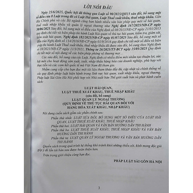 Nhằm phổ biến đến Quý Cơ quan, Đơn vị và Quý khách hàng thân thiết nắm bắt kịp thời những quy định mới nêu trên. Nhà sách Nam Việt xin trân trọng giới thiệu cuốn sách: Luật Hải Quan, Luật Thuế Xuất Khẩu, Thuế Nhập Khẩu (sửa đổi, bổ sung) Luật Quản Lý Ngoại Thương (Quy Định Về Thủ Tục Hải Quan Đối Với Hàng Hóa Xuất Khẩu, Nhập Khẩu)