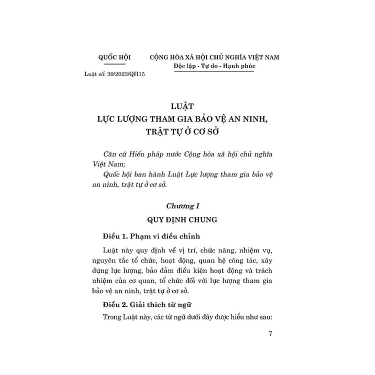 Toàn văn Luật số 30/2023/QH15 Lực lượng tham gia bảo vệ an ninh, trật tự ở cơ sở được Quốc hội nước Cộng hòa xã hội chủ nghĩa Việt Nam khóa XV, kỳ họp thứ 6 thông qua ngày 28/11/2023.
