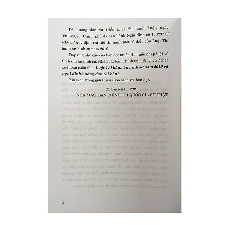 Để hướng dẫn và triển khai thi hành Luật, ngày 09/11/2020, Chính phủ đã ban hành Nghi định số 133/2020/ NĐ-CP quy định chi tiết thi hành một số điều của Luật Thi hành án hình sự năm 2019. Đáp ứng nhu cầu của bạn đọc muốn tìm hiểu pháp luật về thi hành án hình sự, Nhà xuất bản Chính trị quốc gia Sự thật xuất bản cuốn sách Luật Thi hành án hình sự năm 2019 và nghị định hướng dẫn thi hành.