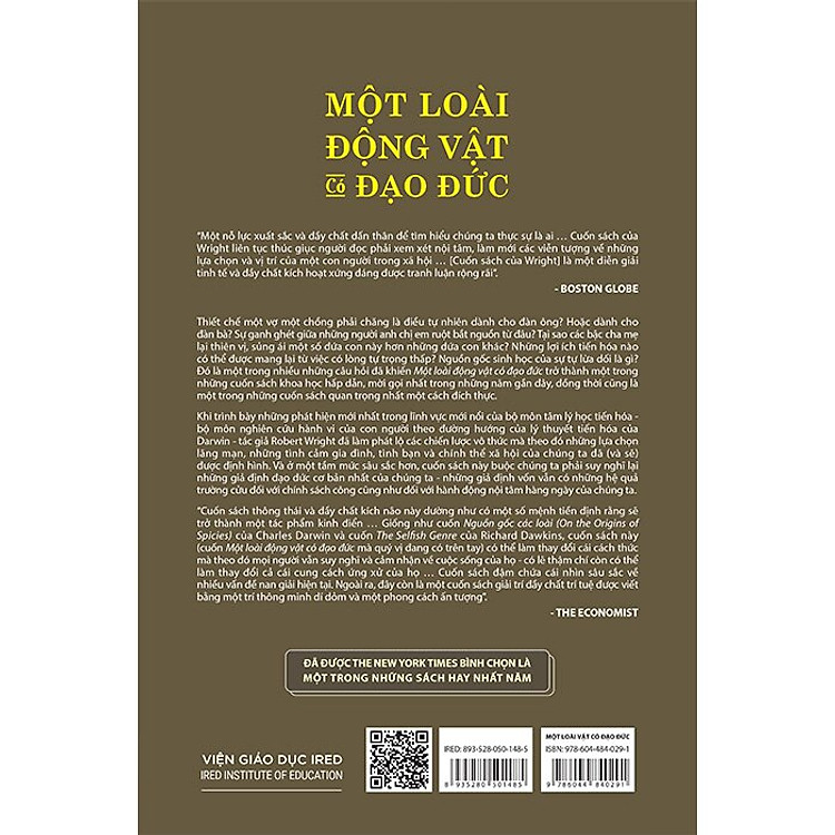 “Thiết chế một vợ một chồng phải chăng là điều tự nhiên dành cho đàn ông? Hoặc dành cho đàn bà? Sự ganh ghét giữa những người anh chị em ruột bắt nguồn từ đâu? Tại sao các bậc cha mẹ lại thiên vị, sủng ái một số đứa con này hơn những đứa con khác? Những lợi ích tiến hóa nào có thể được mang lại từ việc có lòng tự trọng thấp? Nguồn gốc sinh học của sự tự lừa dối là gì? Đó là một trong nhiều những câu hỏi đã khiến Một loài động vật có đạo đức trở thành một trong những cuốn sách khoa học hấp dẫn, mời gọi nhất trong những năm gần đây, đồng thời cũng là một trong những cuốn sách quan trọng nhất một cách đích thực. Khi trình bày những phát hiện mới nhất trong lĩnh vực mới nổi của bộ môn tâm lý học tiến hóa – bộ môn nghiên cứu hành vi của con người theo đường hướng của lý thuyết tiến hóa của Darwin – tác giả Robert Wright đã làm phát lộ các chiến lược vô thức mà theo đó những lựa chọn lãng mạn, những tình cảm gia đình, tình bạn và chính thể xã hội của chúng ta đã (và sẽ) được định hình. Và ở một tầm mức sâu sắc hơn, cuốn sách này buộc chúng ta phải suy nghĩ lại những giả định đạo đức cơ bản nhất của chúng ta – những giả định vốn vẫn có những hệ quả trường cửu đối với chính sách công cũng như đối với hành động nội tâm hàng ngày của chúng ta. “Cuốn sách thông thái và đầy chất kích não này dường như có một số mệnh tiền định rằng sẽ trở thành một tác phẩm kinh điển Giống như cuốn Nguồn gốc các loài (On the Origins of Spicies) của Charles Darwin và cuốn The Selfish Genre của Richard Dawkins, cuốn sách này (cuốn Một loài động vật có đạo đức mà quý vị đang có trên tay) có thể làm thay đổi cái cách thức mà theo đó mọi người vẫn suy nghĩ và cảm nhận về cuộc sống của họ – có lẽ thậm chí còn có thể làm thay đổi cả cái cung cách ứng xử của họ Cuốn sách đậm chứa cái nhìn sâu sắc về nhiều vấn đề nan giải hiện tại. Ngoài ra, đây còn là một cuốn sách giải trí đầy chất trí tuệ được viết bằng một trí thông minh dí dỏm và một phong cách ấn tượng”. – The Economist