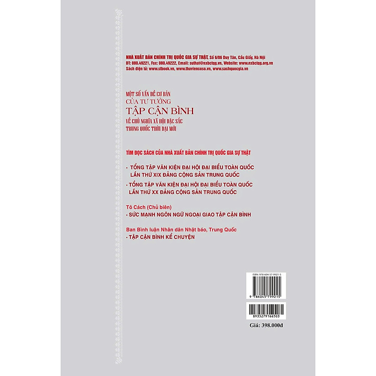 Để tìm hiểu rõ hơn những vấn đề, nội dung có liên quan trong tư tưởng Tập Cận Bình về chủ nghĩa xã hội đặc sắc Trung Quốc thời đại mới, Nhà xuất bản Chính trị quốc gia Sự thật tổ chức biên dịch, xuất bản cuốn sách Một số vấn đề cơ bản của tư tường Tập Cận Bình về chủ nghĩa xã hội đặc sắc Trung Quốc thời đại mới do Trường Đảng Trung ương Đảng Cộng sản Trung Quốc (Học viện Hành chính quốc gia) phối hợp với Nhà xuất bản Nhân dân, Trung Quốc xuất bản. Cuốn sách gồm phần Giới thiệu, 15 chương nội dung chính và Kết luận, tập trung phân tích những vấn đề về quan điểm lý luận, phương châm, sách lược… trong tư tưởng Tập Cận Bình về chủ nghĩa xã hội đặc sắc Trung Quốc thời đại mới, như: kiên trì và phát triển hơn nữa chủ nghĩa xã hội đặc sắc Trung Quốc; kiên trì lập trường căn bản lấy nhân dân làm trung tâm; quan điểm phát triển mới “sáng tạo, hài hòa, xanh, mở cửa, cùng chia sẻ”; kiên trì đi sâu cải cách toàn diện và mở cửa toàn diện; xây dựng Trung Quốc thành cường quốc hiện đại hóa xã hội chủ nghĩa giàu mạnh, dân chủ, văn minh, hài hòa, tươi đẹp; thực hiện Giấc mơ Trung Quốc phục hưng vĩ đại dân tộc Trung Hoa