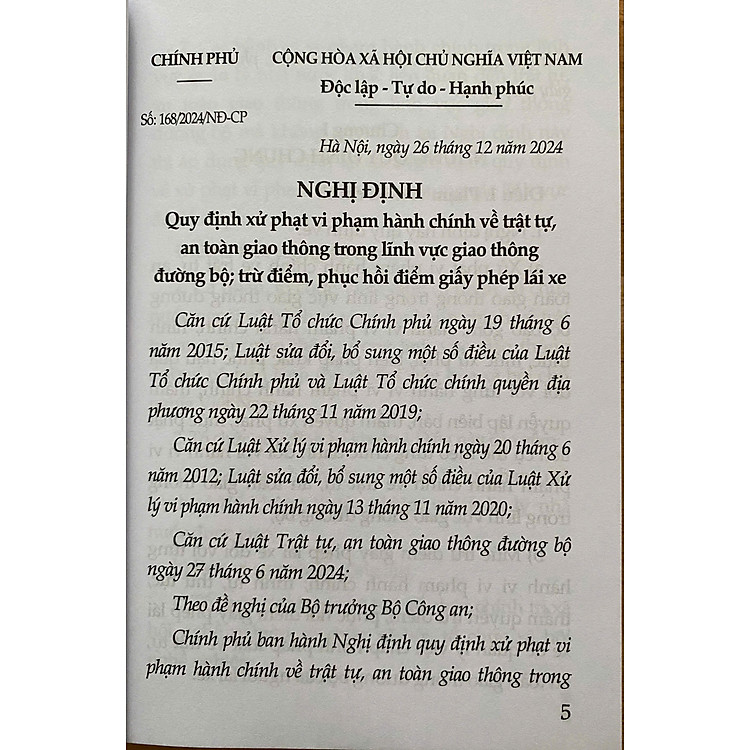 Nghị định 168/2024/NĐ-CP ngày 26-12-2024 của Chính Phủ Quy Định Xử Phạt Vi Phạm Hành Chính Về Trật Tự, An Toàn Giao Thông Trong Lĩnh Vực Giao Thông Đường Bộ; Trừ Điểm, Phục Hồi Điểm Giấy Phép Lái Xe