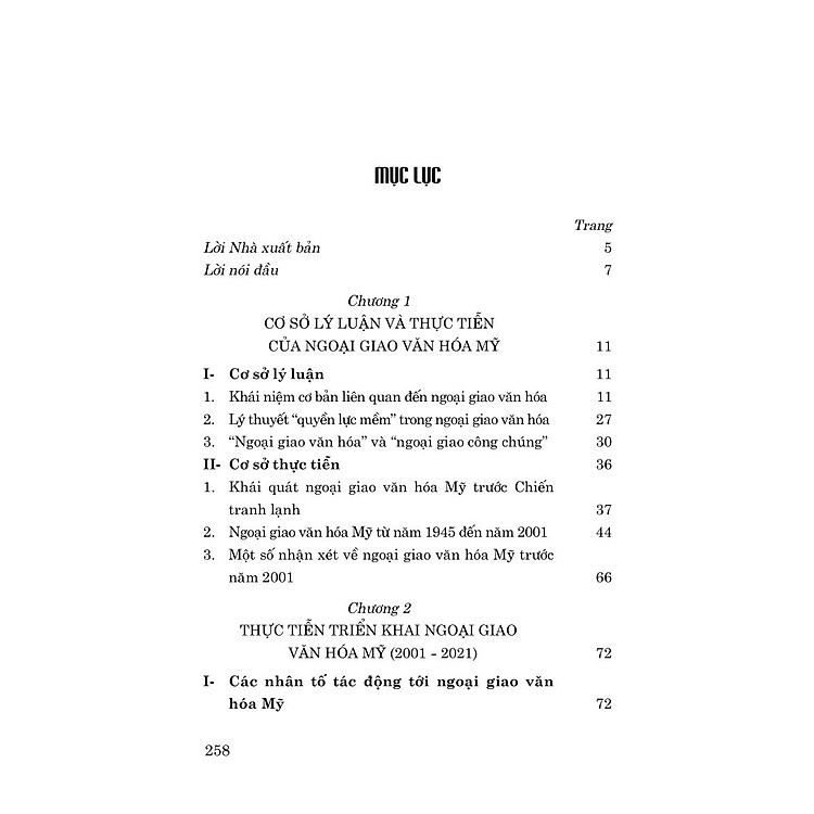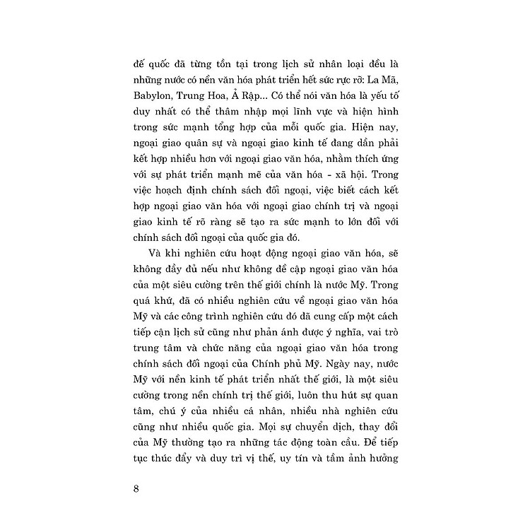 Cuốn sách giúp người đọc hình dung một cách bao quát về bức tranh ngoại giao văn hóa Mỹ và những đặc trưng cơ bản của ngoại giao văn hóa Mỹ được biểu hiện qua các giai đoạn lịch sử, tập trung vào hai thập niên đầu thế kỷ XXI, với sự cầm quyền của các tổng thống G.W. Bush, Barack Obama và Donald Trump. Xin trân trọng giới thiệu cuốn sách cùng bạn đọc