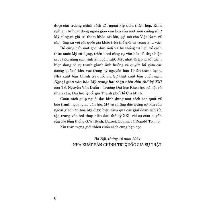 Đọc sách không chỉ là giải trí, mà trên hết còn mang lại góc nhìn khác cho bạn đọc. Nếu bạn yêu thích, Ngoại giao văn hóa Mỹ trong hai thập niên đầu thế kỷ XXI (bản in 2024) là lựa chọn đáng cân nhắc.