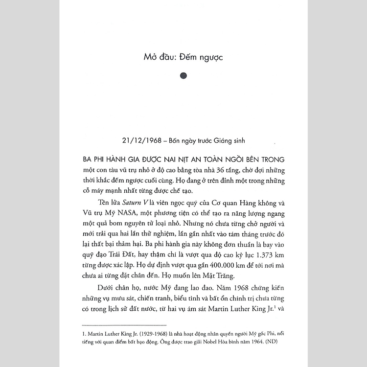 Tên lửa Saturn V là viên ngọc quý của Cơ quan Hàng không và Vũ trụ Mỹ NASA, một phương tiện có thể tạo ra năng lượng ngang một quả bom nguyên tử loại nhỏ. Nhưng nó chưa từng chở người và mới trải qua hai lần thử nghiệm, lần gần nhất vào tám tháng trước đó lại thất bại thảm hại. Ba phi hành gia này không đơn thuần là bay vào quỹ đạo Trái Đất, hay thậm chí là vượt qua độ cao kỷ lục 1.373 km từng được xác lập. Họ dự định vượt qua gần 400.000 km để tới nơi mà chưa ai từng đặt chân đến. Họ muốn lên Mặt Trăng.