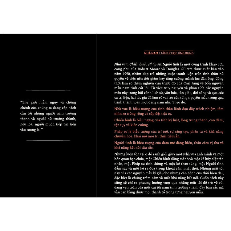 Nhưng luôn tồn tại ở đó ranh giới giữa một Nhà vua anh minh và một hôn quân bạo chúa, một Chiến binh dũng mãnh và một kẻ hủy diệt tàn nhẫn, một Pháp sư tinh thông và một kẻ thao túng, một Người tình đắm say và một kẻ sa đọa trong khoái cảm nhất thời. Những mặt tối này của các nguyên mẫu lý giải cho những căn bệnh của thời hiện đại, đặc biệt là chứng trầm cảm và mất khả năng kết nối. Cuốn sách này cũng sẽ chỉ ra phương hướng vượt qua những mặt tối để trở về với dạng vẹn toàn của một cái tôi nam tính trưởng thành đầy bản sắc mà vẫn cân bằng được mọi thành tố trong từng nguyên mẫu.