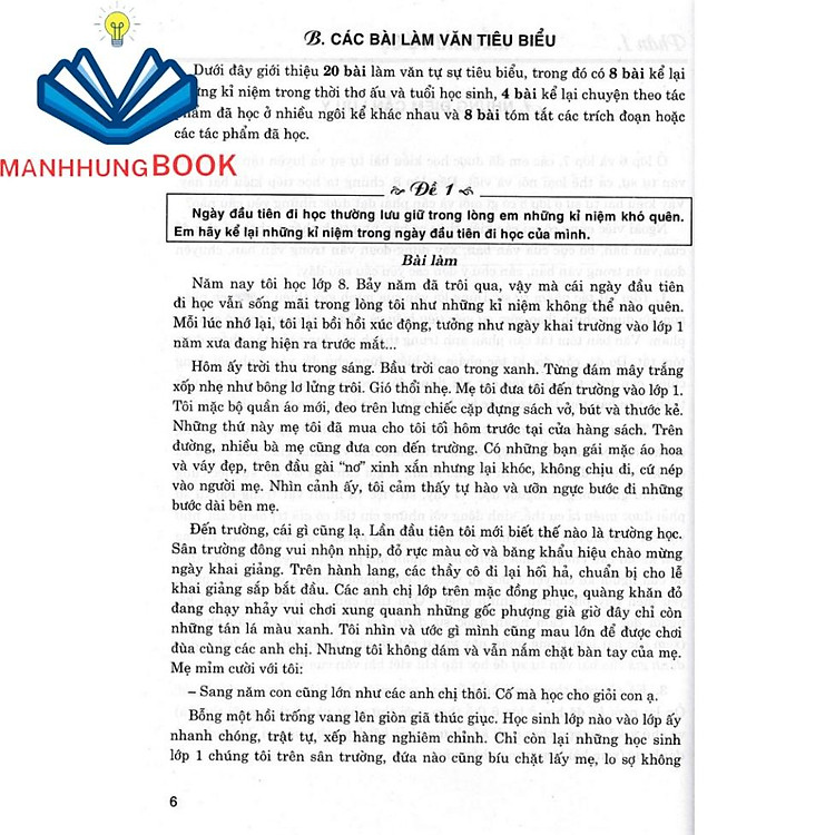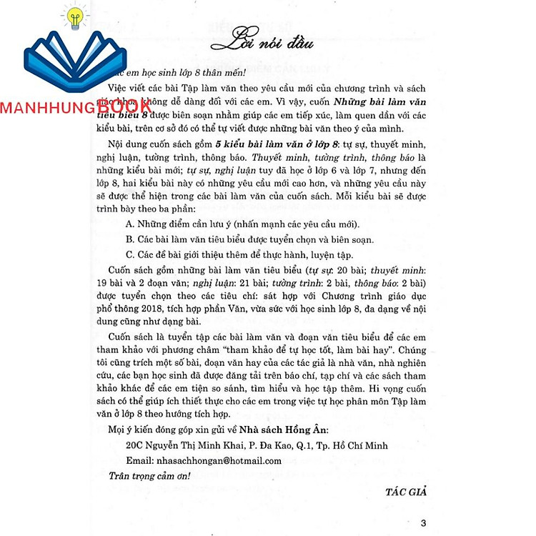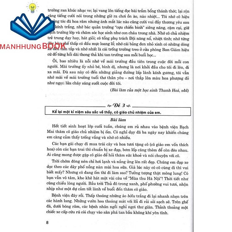 - Title: “Mua Sách – Những Bài Làm Văn Tiêu Biểu 8” from Nhà sách Mạnh Hùng.