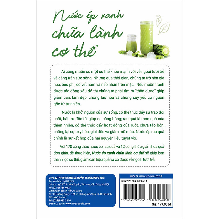 Tập trung vào các nguyên nhân gây ra tình trạng béo phì, táo bón, lão hóa Nước ép xanh chữa lành cơ thể giới thiệu 170 công thức nước ép rau củ và 12 công thức giấm hoa quả, đơn giản, dễ thực hiện, giúp cơ thể bài tiết tốt hơn, thanh lọc cơ thể, bổ sung dưỡng chất để bạn có được cơ thể khỏe mạnh và vẻ ngoài tươi trẻ.
