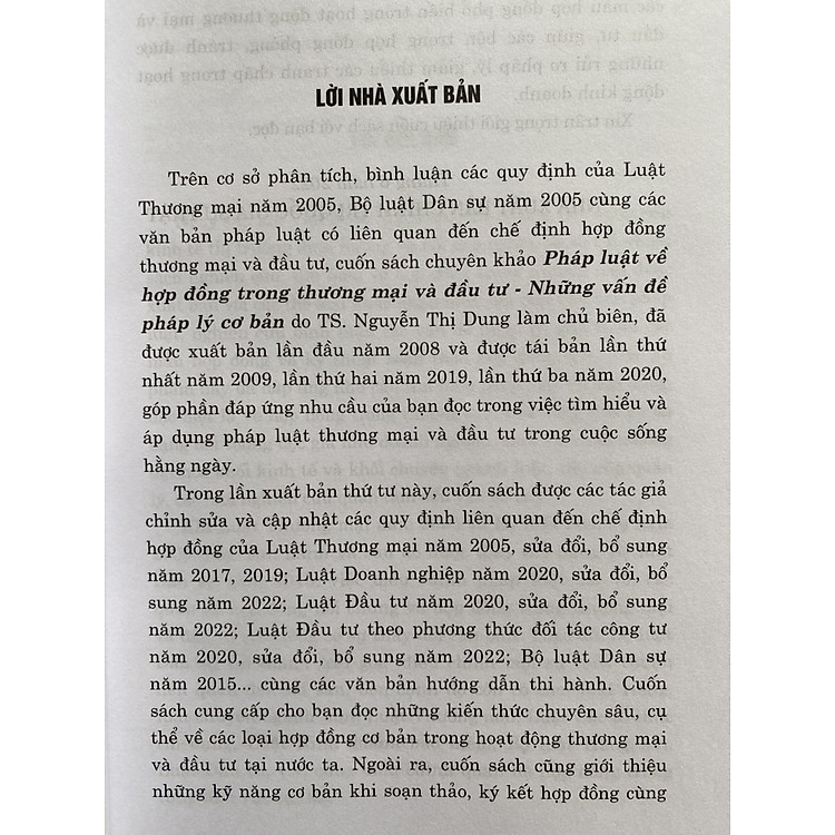 Trên cơ sở phân tích, bình luận các quy định của luật thương mại năm 2005 ,bộ luật dân sự năm 2005 cùng các văn bản pháp luật có liên quan đến chế định hợp đồng thương mại và đầu tư cuốn sách chuyên khảo pháp luật về hợp đồng trong thương mại và đầu tư cuốn sách chuyên khảo” Pháp Luật Về Hợp Đồng Trong Thương Mại Và Đầu Tư-Những Vấn Đề Pháp Lý Cơ Bản do TS. Nguyễn Thị Dung làm chủ biên, đã được xuất bản lần đầu năm 2008 và được tái bản lần thứ nhất năm 2009,lần thứ hai năm 2019,Lần thứ ba năm 2020 góp phần đáp ứng nhu cầu của bạn đọc trong tìm hiểu và áp dụng thương mại và đầu tư trong cuộc sống hằng ngày