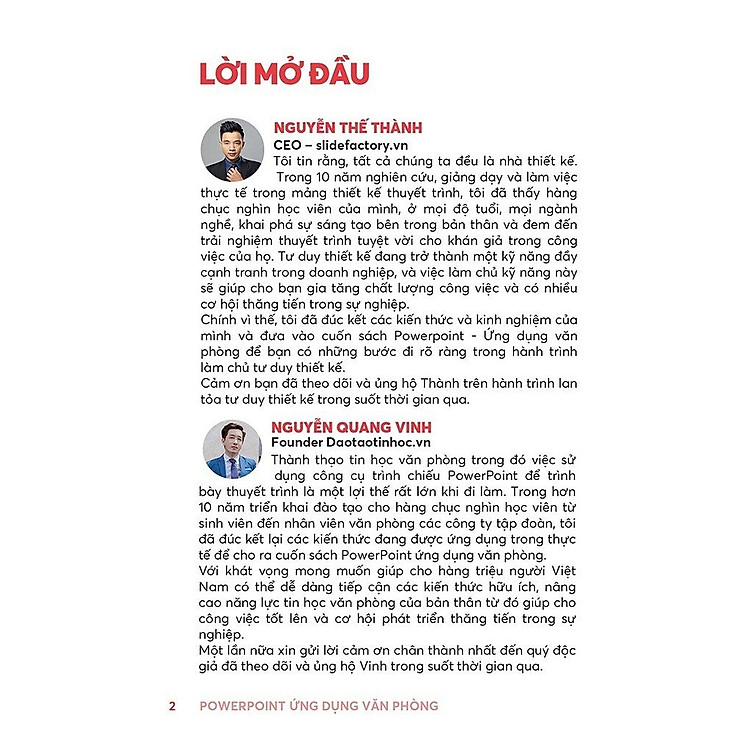 + Tư duy thiết kế đang trở thành một kỹ năng đầy cạnh tranh trong doanh nghiệp, và việc làm chủ kỹ năng này sẽ giúp cho bạn gia tăng chất lượng công việc và có nhiều cơ hội thăng tiến trong sự nghiệp. Chính vì thế chúng tôi đúc kết các kiến thức và kinh nghiệm đưa vào cuốn sách Powerpoint – Ứng dụng văn phòng để bạn có những bước đi rõ ràng trong hành trình làm chủ tư duy thiết kế.