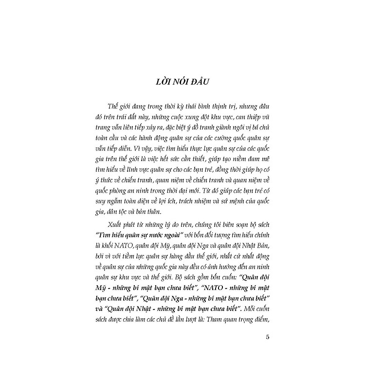 Bộ sách gồm bốn cuốn: “Quân đội Mỹ – những bí mật bạn chưa biết”, “NATO – những bí mật bạn chưa biết”, “Quân đội Nga – những bí mật bạn chưa biết” và “Quân đội Nhật – những bí mật bạn chưa biết”.