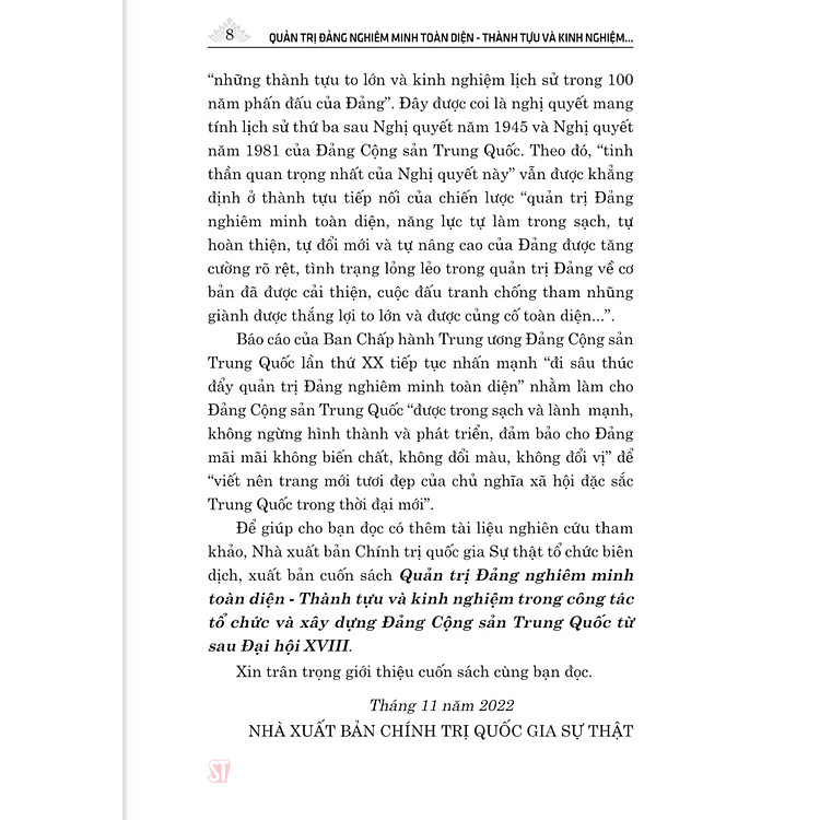 Giới thiệu Quản trị Đảng nghiêm minh toàn diện. Thành tựu và kinh nghiệm trong công tác tổ chức và xây dựng Đảng Cộng sản Trung Quốc từ sau đại hội XVIII